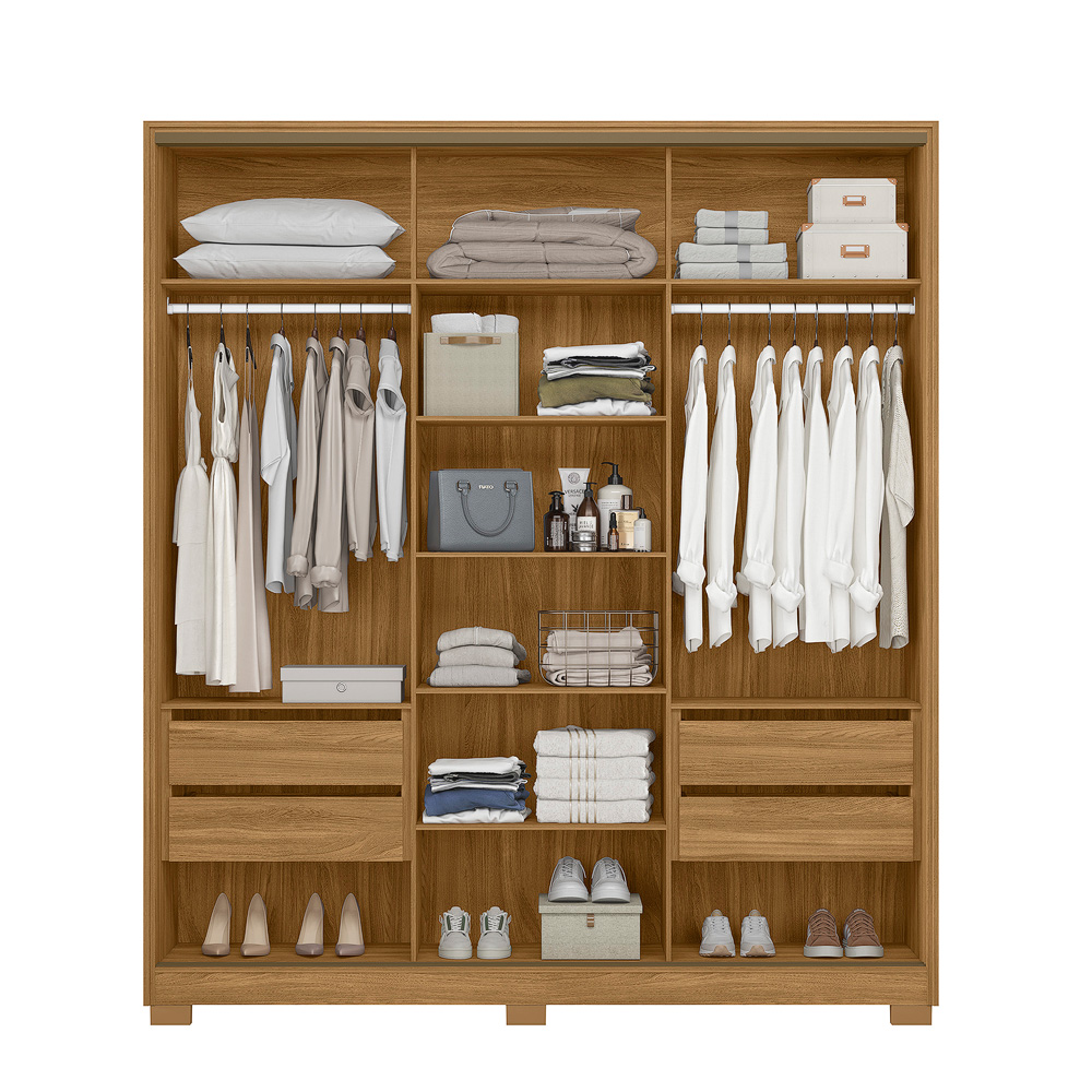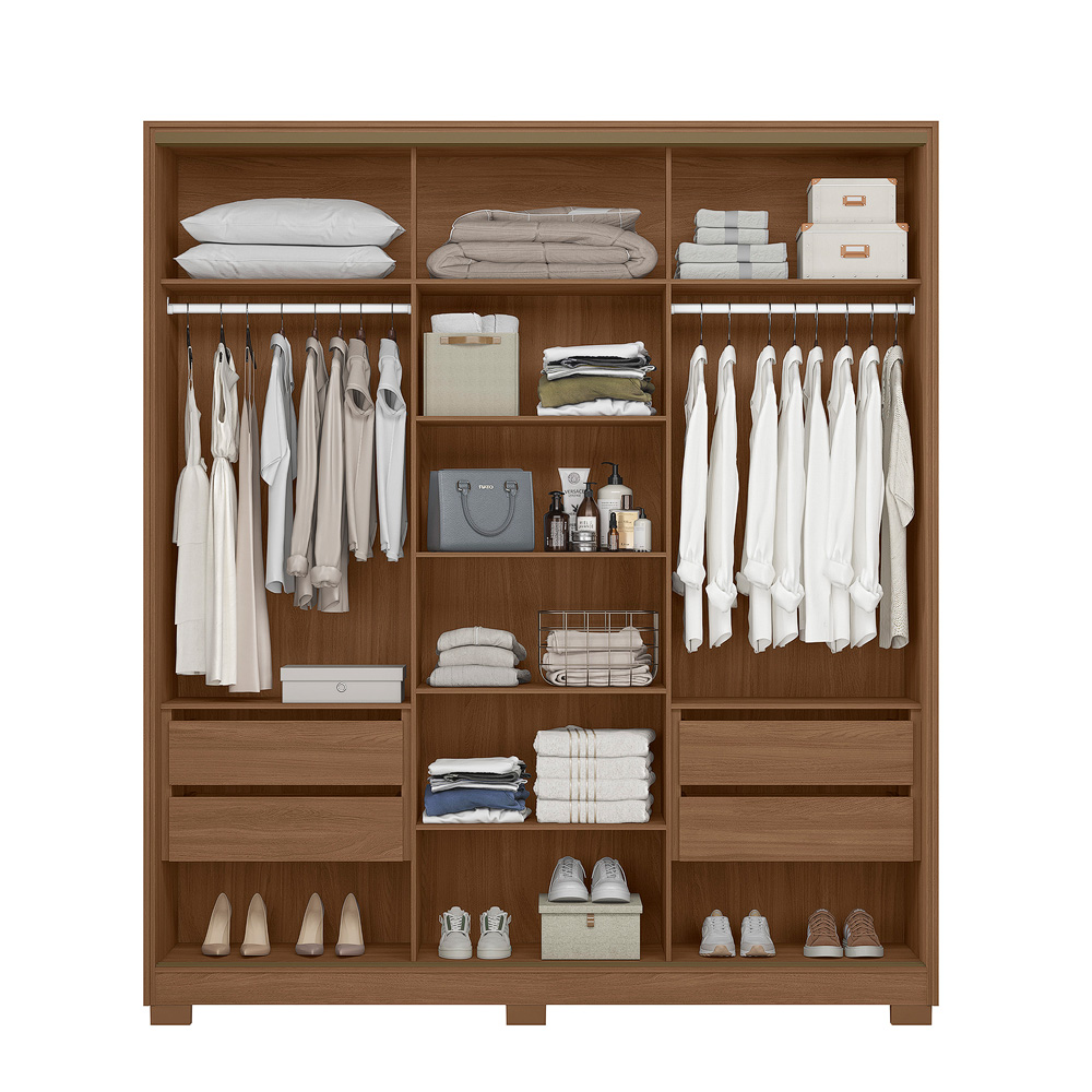O Guarda-Roupa Dallas combina modernidade e funcionalidade para otimizar seu espaço. Possui portas deslizantes com trilho em alumínio, garantindo leveza e praticidade no uso diário. Conta com 4 gavetas com corrediças telescópicas, cabideiros em alumínio e excelente distribuição interna. As portas laterais com detalhes frisados e molduras reforçadas agregam sofisticação, enquanto o sistema anti-empeno metálico assegura maior resistência e durabilidade.