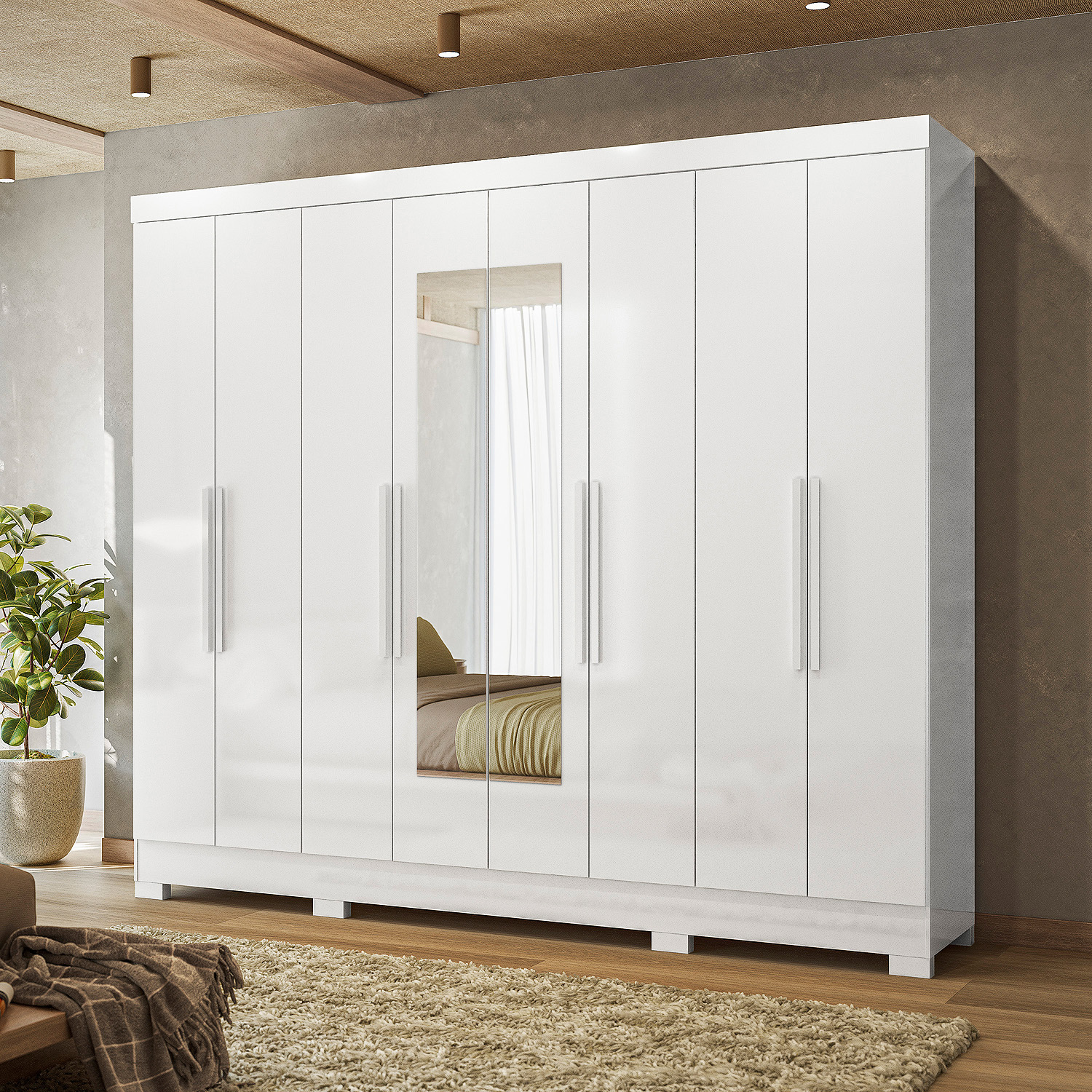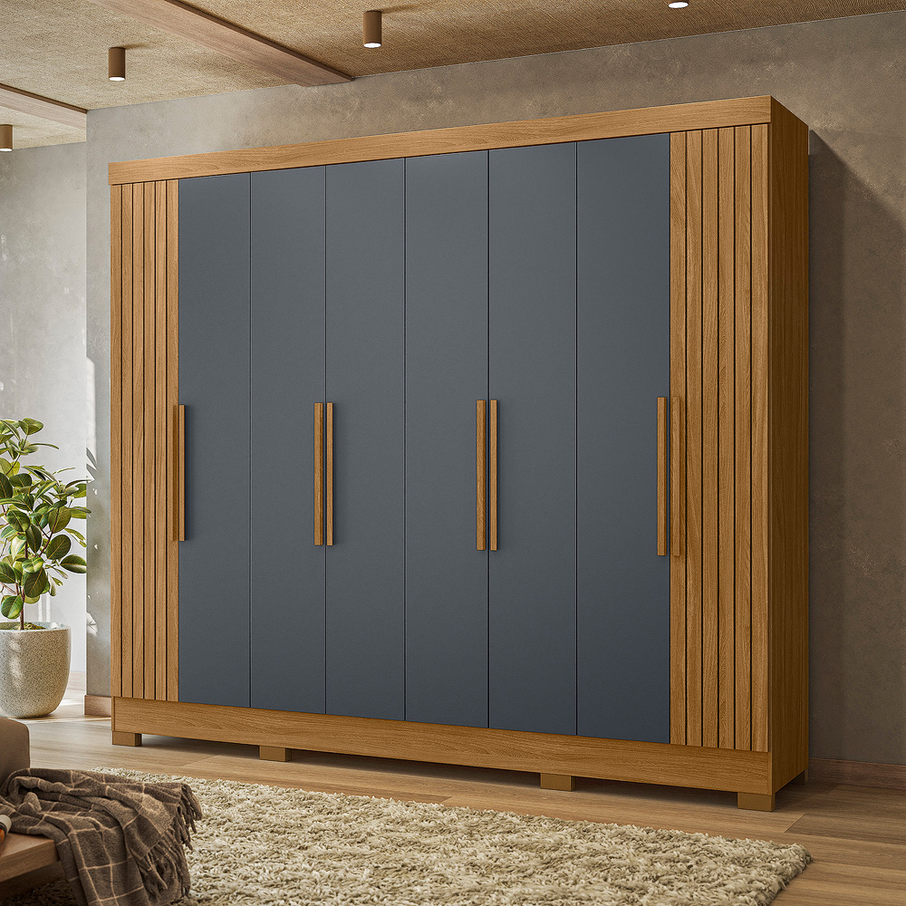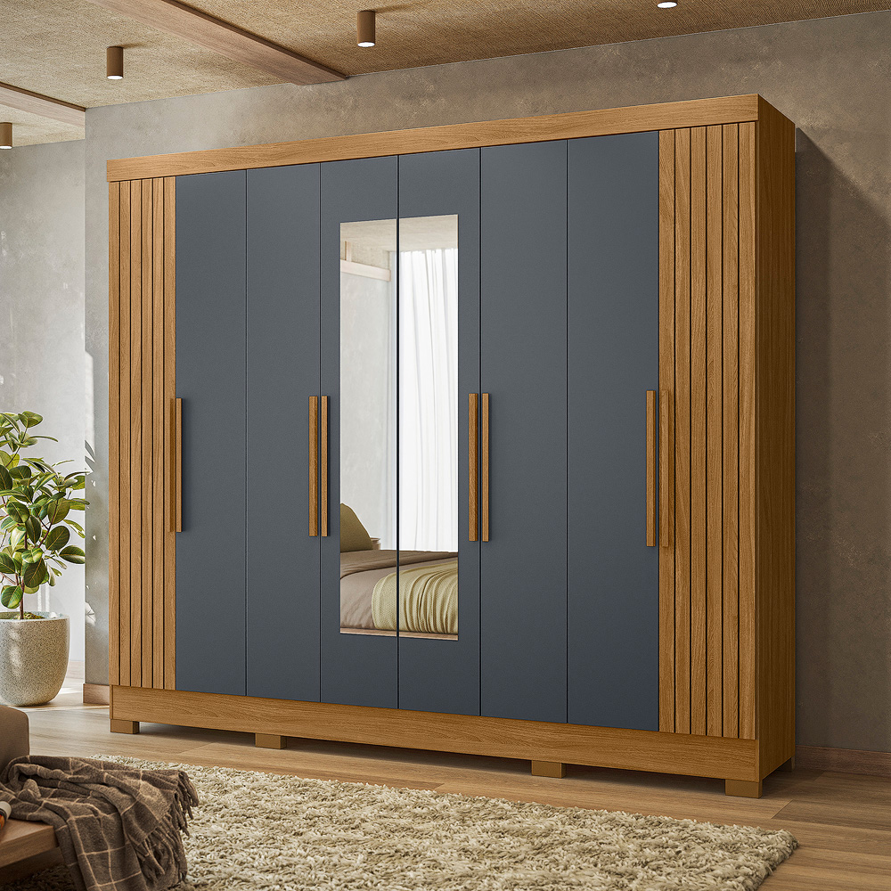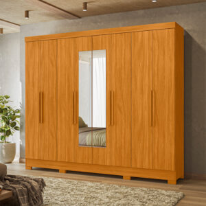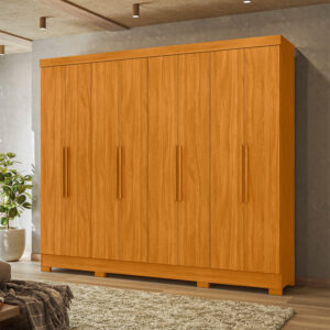 Com oito portas de giro e quatro gavetas espaçosas, o Guarda-Roupa Diplomata une beleza e funcionalidade. Os cabideiros em alumínio e os puxadores em MDF garantem praticidade no dia a dia. As portas em MDF com detalhes frisados opcionais e espelhos agregam sofisticação ao ambiente.