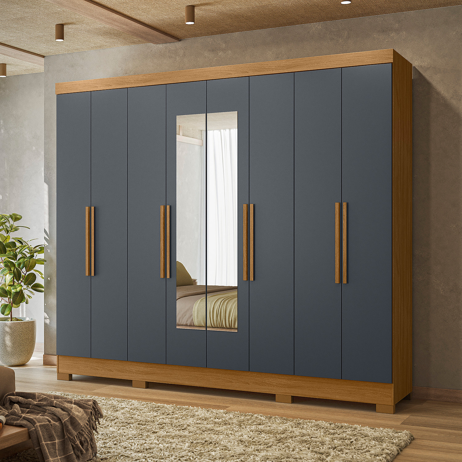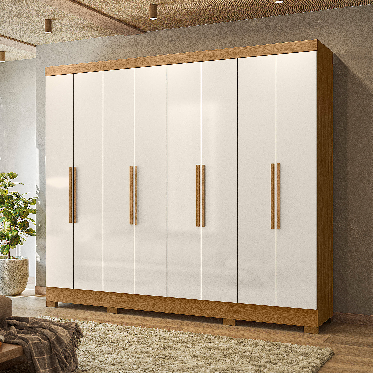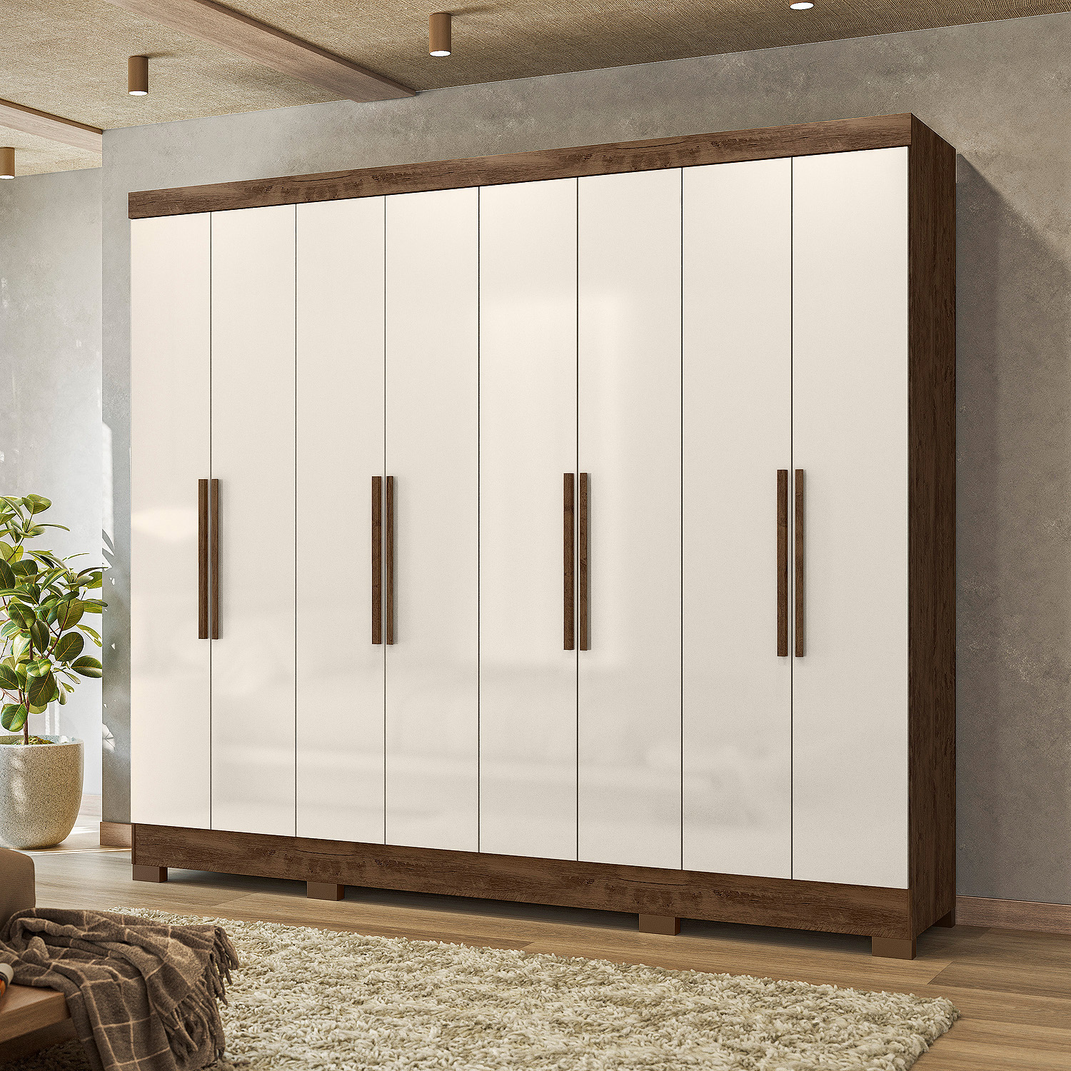 Com oito portas de giro e quatro gavetas espaçosas, o Guarda-Roupa Diplomata une beleza e funcionalidade. Os cabideiros em alumínio e os puxadores em MDF garantem praticidade no dia a dia. As portas em MDF com detalhes frisados opcionais e espelhos agregam sofisticação ao ambiente.
